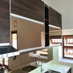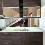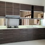 Penggunaan aksen kaca “brown mirror” membuat dapur ini terlihat lebih luas dan elegan.