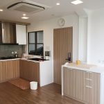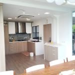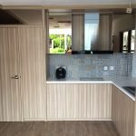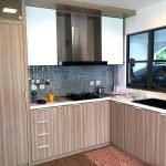 Bahan yang kami gunakan adalah HPL untuk finishing kabinet, cat duco putih untuk aksen bebrapa pintu dan solid surface putih untuk meja kitchen.