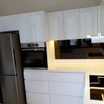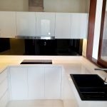 Finishing super glossy duco paint pada kabinet, solid surface putih pada top table, dan penggunaan kaca hitam pada dinding belakang yang menimbulkan effek kontras yang indah.